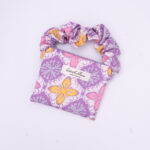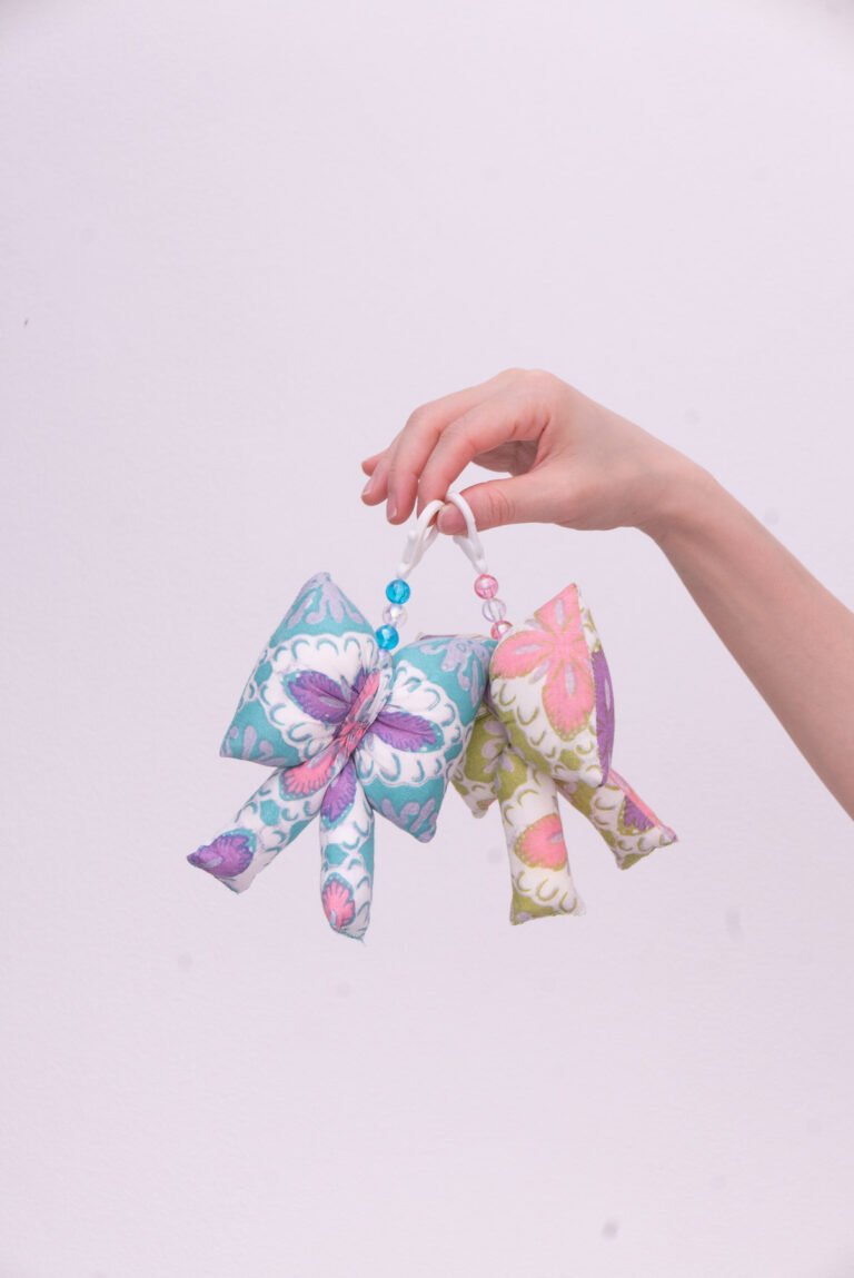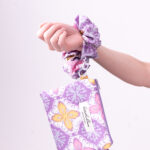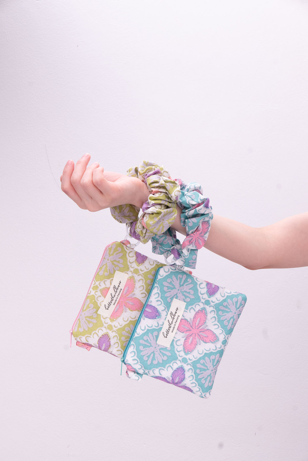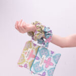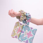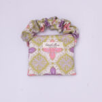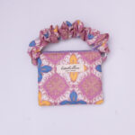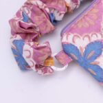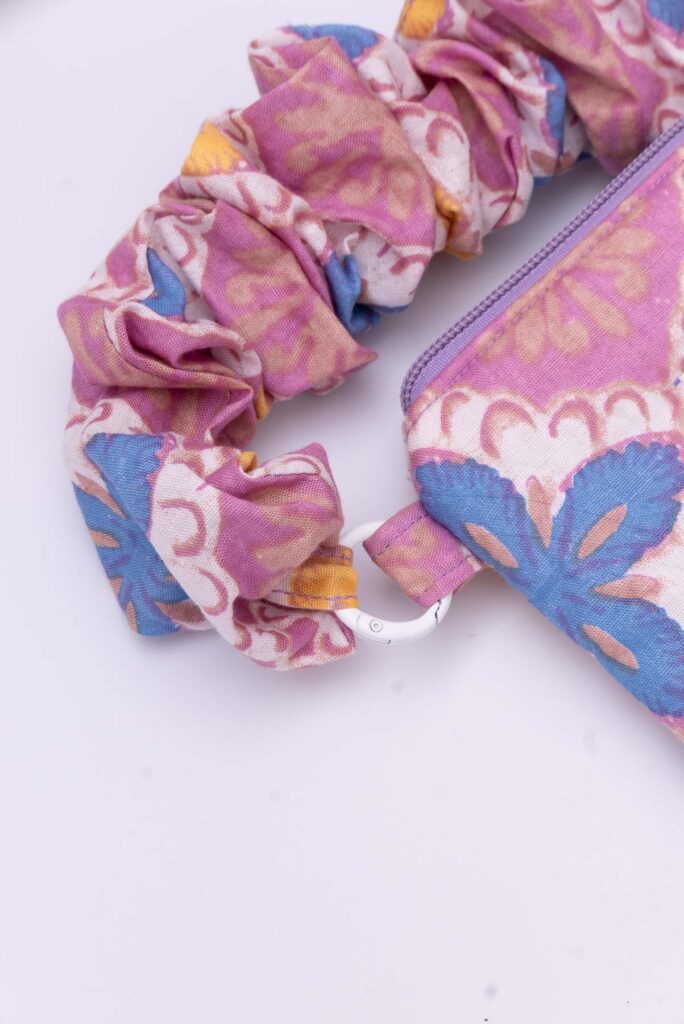The scrunched handle is elasticated and removable and can be used to loop around whatever you fancy, you can also interchange the coloured handles for mixing and matching! 🙂